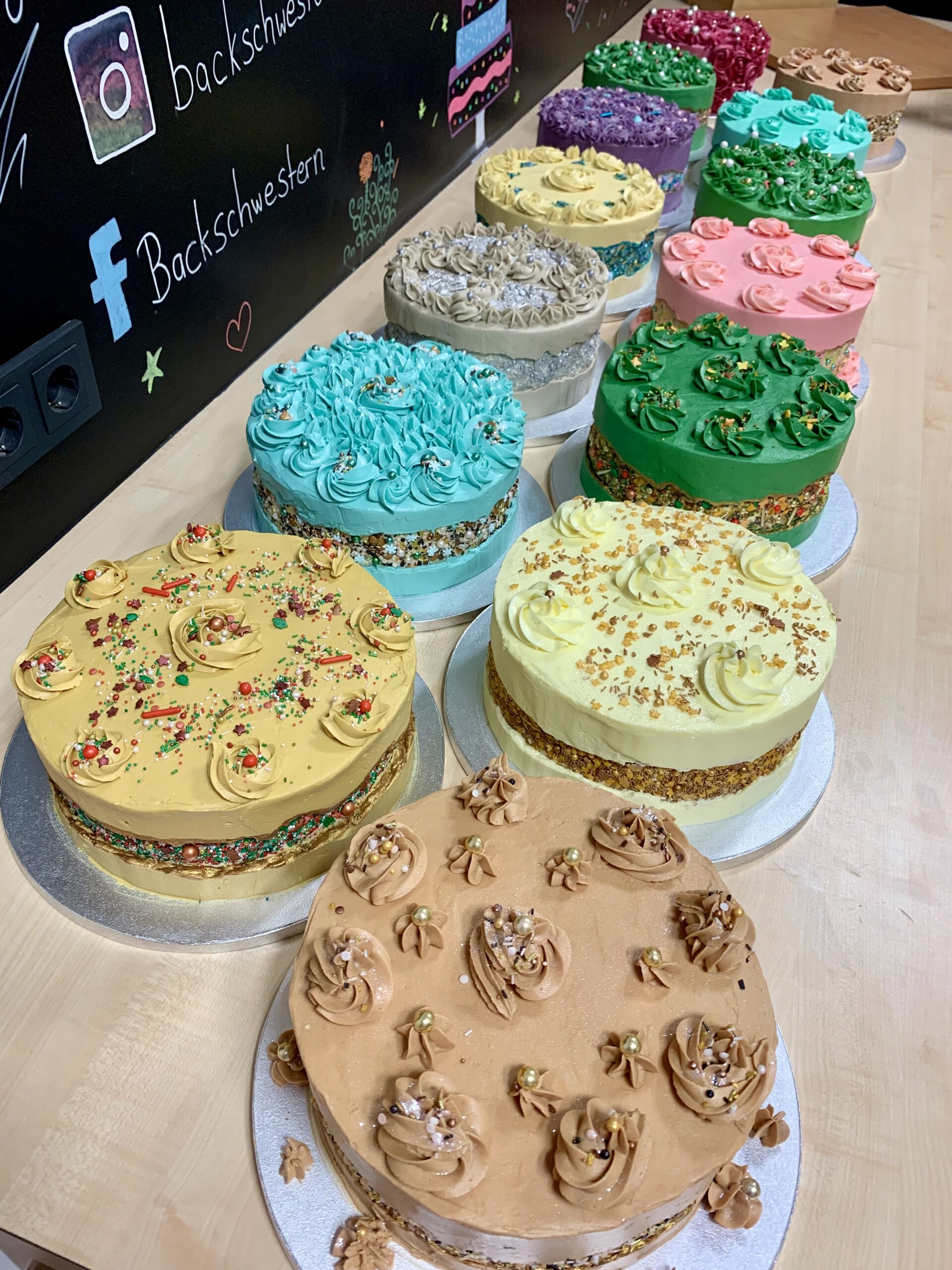 Wir verwenden ausschließlich Produkte der Backschwestern: „Backmischung für Biskuit“, „Drin-Drunter-Drauf-Tortencreme“ und/oder „Creme formidable“. Das Rezept für den Biskuit „Wiener Boden“ erhaltet ihr am Ende des Kurses.