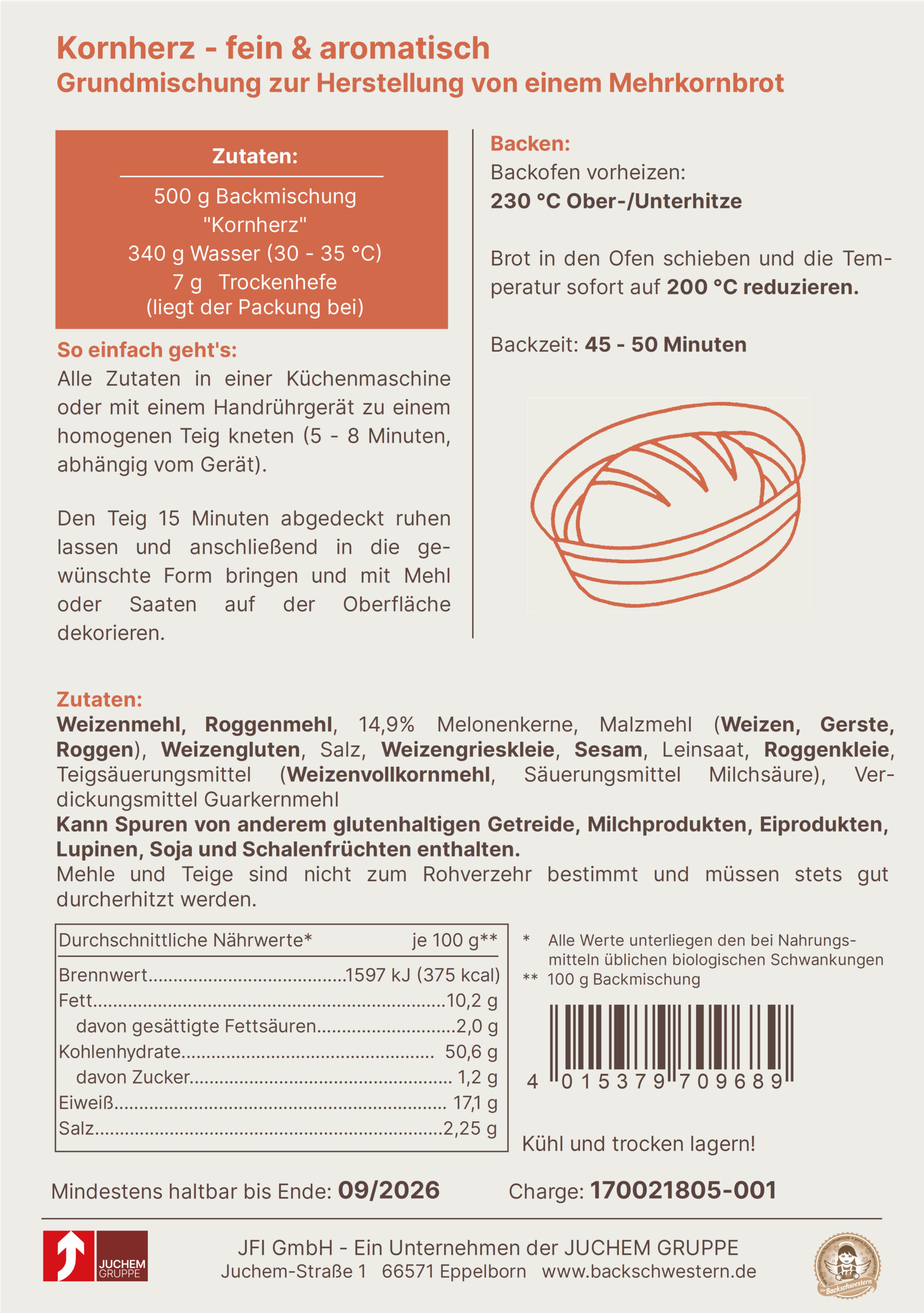 Allergene sind in der Zutatenliste fett hervorgehoben. In unserem Betrieb werden glutenhaltiges Getreide und -erzeugnisse, Eier und -erzeugnisse, Soja und -erzeugnisse, Milch und -erzeugnisse einschl. Lactose, Schalenfrüchte (z.B. Nüsse, Mandeln) und -erzeugnisse, Sesam und -erzeugnisse sowie Lupine verarbeitet. Kreuzkontaminationen mit den zuvor genannten Produkten sind möglich.