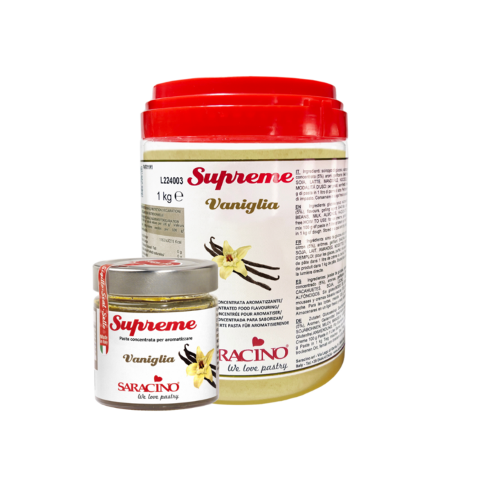 Unsere Aromapasten, die wir aufgrund ihrer hohen Qualität „SUPREME“ genannt haben, wurden im Laufe unserer 20-jährigen Produktionserfahrung für den professionellen Bereich entwickelt und werden nun auch in eleganten 200g-Packungen angeboten, die sich bestens für den Hausgebrauch eignen. Alle Pasten haben die gleichen Eigenschaften: Sie sind glutenfrei, ohne gehärtete Fette und ohne Palmöl.