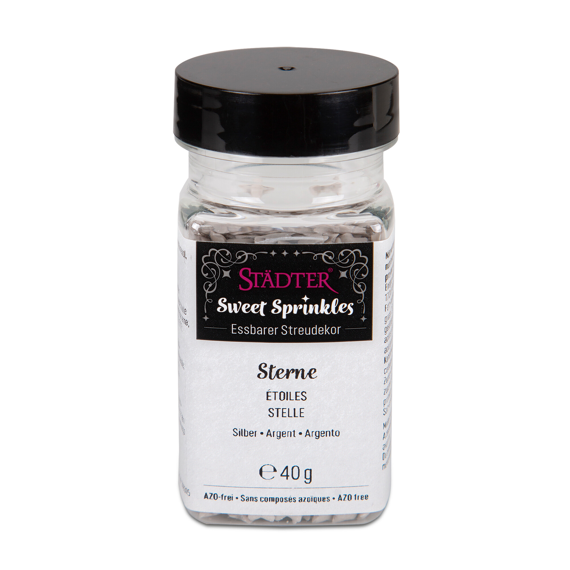 Sterne Silber – Essbarer Streudekor glimmer 40 g. Zum Dekorieren und Verzieren von Pralinen, Petits Fours, Torten u.v.m.