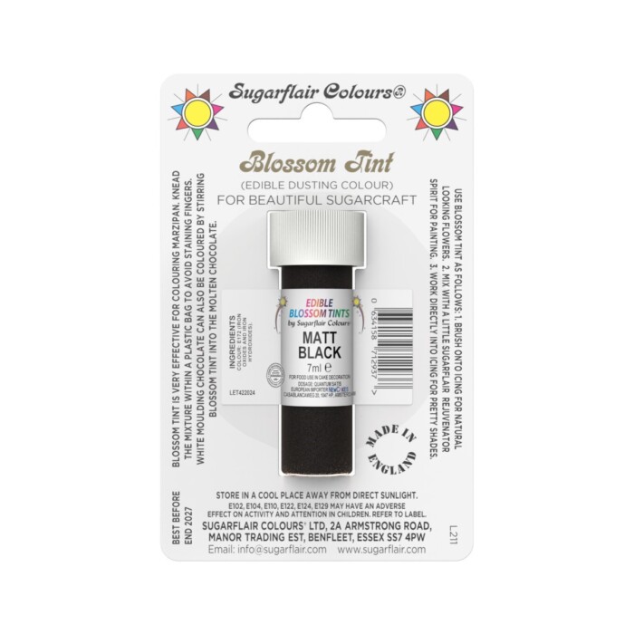 Dieser mattschwarze Farbstoff von Sugarflair ist ein essbares Farbpulver mit dem Sie schöne natürliche Effekte auf Blumen und Blättern aus Marzipan, Fondant oder Blütenpaste kreieren. Es ist daneben auch für Gesichter, Figuren, u.a. gut geeignet. Um ein optimales Ergebnis zu erzielen, tragen Sie das Pulver mit einem weichen Pinsel sparsam auf.