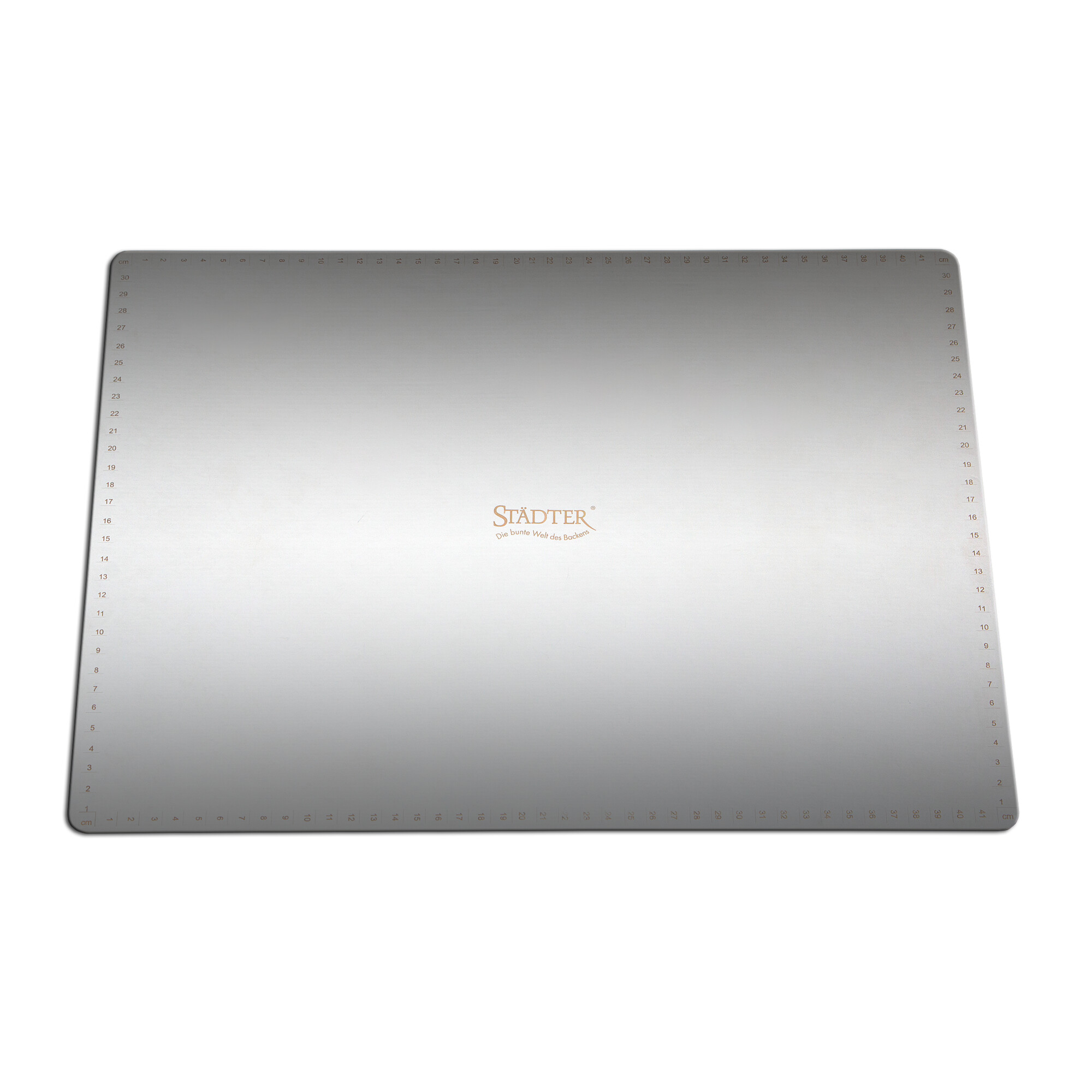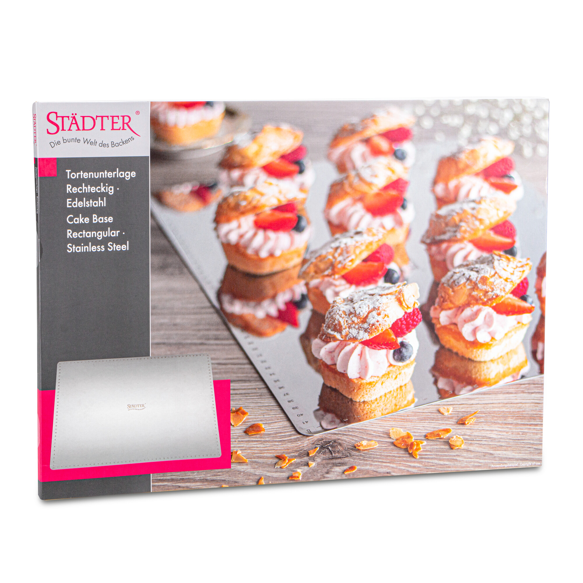 Tortenunterlage 43,5 x 32 cm / H 0,8 mm rechteckig, Material Edelstahl, Oberfläche glänend. Praktische, stabile Unterlage um den Kuchen oder die Torte zu dekorieren, oder das Kunstwerk später von der Arbeitsplatte auf die Tortenplatte zu heben. Mit praktischer Zentimetereinteilung am Rand für genaues Zuschneiden der Böden.