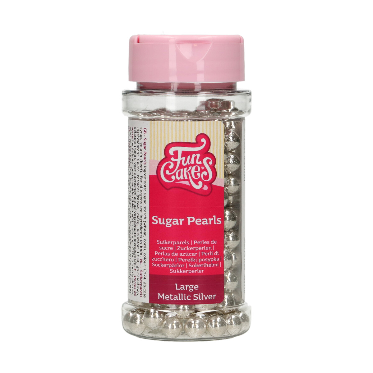 FunCakes Zuckerperlen Metallic Silber, essbare silberne Perlen mit einem Durchmesser von 8 mm. Mit diesen Zuckerperlen sind viele schöne Dekorationsakzente möglich, z.B. als Blumenherz oder als Tortenrand. Verpackt in einem praktischen Streuer.